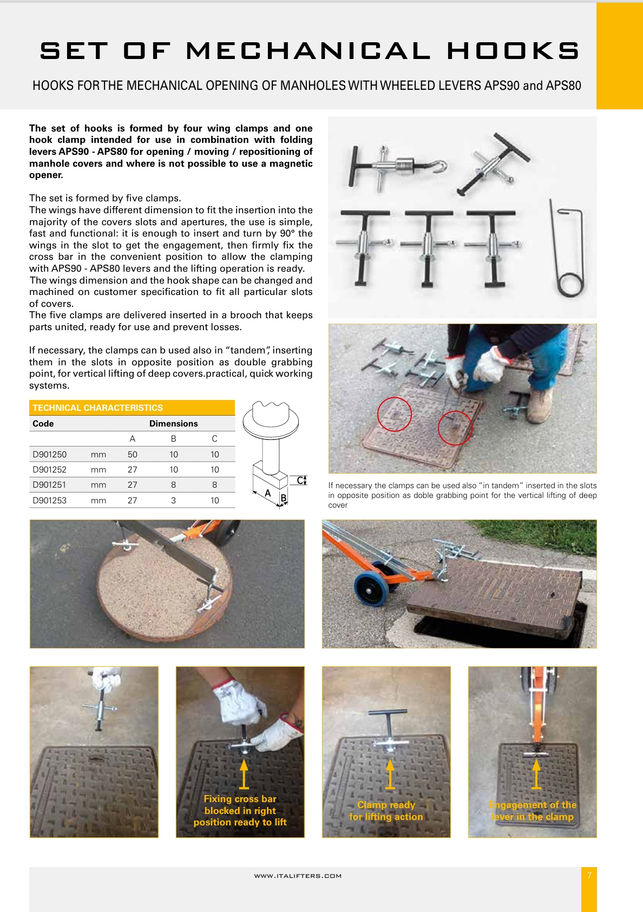The set is formed by five clamps. The wings have different dimension to fit the insertion into the majority of the covers slots and apertures, the use is simple, fast and functional: it is enough to insert and turn by 90° the wings in the slot to get the engagement, then firmly fix the cross bar in the convenient position to allow the clamping with APS90 - APS80 levers and the lifting operation is ready. The wings dimension and the hook shape can be changed and machined on customer specification to fit all particular slots of covers. The five clamps are delivered inserted in a brooch that keeps parts united, ready for use and prevent losses. If necessary, the clamps can b used also in “tandem”, inserting them in the slots in opposite position as double grabbing point, for vertical lifting of deep covers.practical, quick working systems.