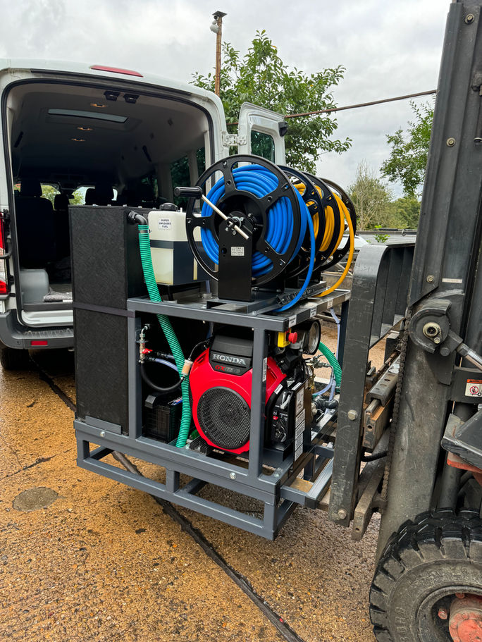 The main purpose of this adaptor is if you are doing a lot of site work with the jetter or you want the conveniance of the full 3008 machine with the high pressure and inlet reel on top but dont need it full time, if thats the case then you can lift it straight in and out of a van with ease and either store it or leave it on site.